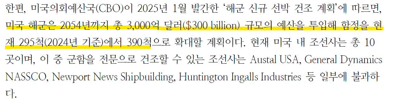 비핵심 전력 함정 건조 예산으로 배정된 것이 대부분 국내수혜를 볼 것으로 예상됨.(개인적인 의견) 왜? 일단 핵잠수함 건조능력이 없음. 한국은 디젤잠수함.. 그리고 전부 무기시스템체계는 공개할 수 없음. 그 안에 들어가는 기술 등 즉, 핵심이 되는 전력 함정 건조는 해외에서 하기 어려움. (물론 너무 급해서 가능성이 제로라고 할 순 없다.) 어쨌든.... 한국 조선에는 긍정적이라고 판단.