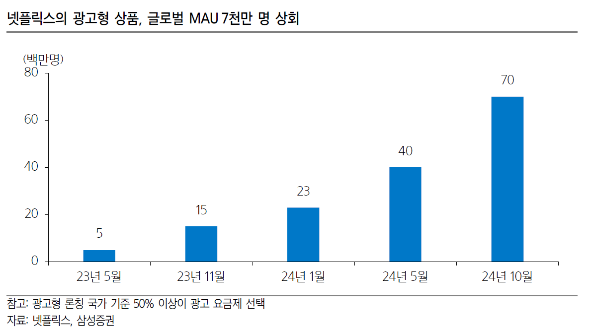 계정 공유 단속을 강화하면서 광고형 상품 가입자가 크게 늘었고, 작년 10월 기준 광고형 요금제 출시국가를 기준으로 광고 요금제 활성 이용자 수는 7000만 명을 상회했음.