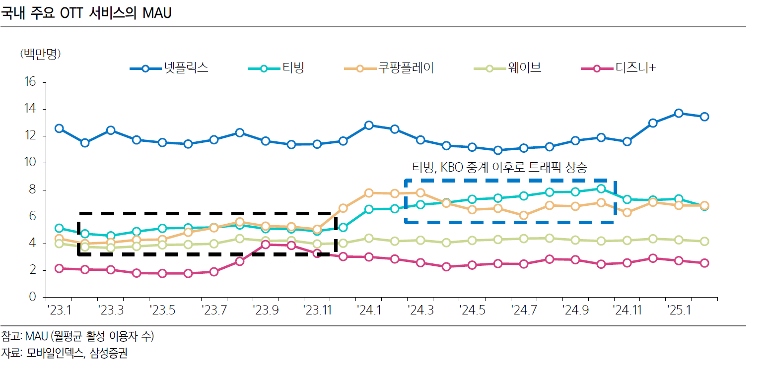 25년 2월 MAU(월평균 활성 이용자 수) 기준으로 쿠팡플레이가 티빙을 앞질렀으며, 넷플릭스 1,345만 명, 쿠팡플