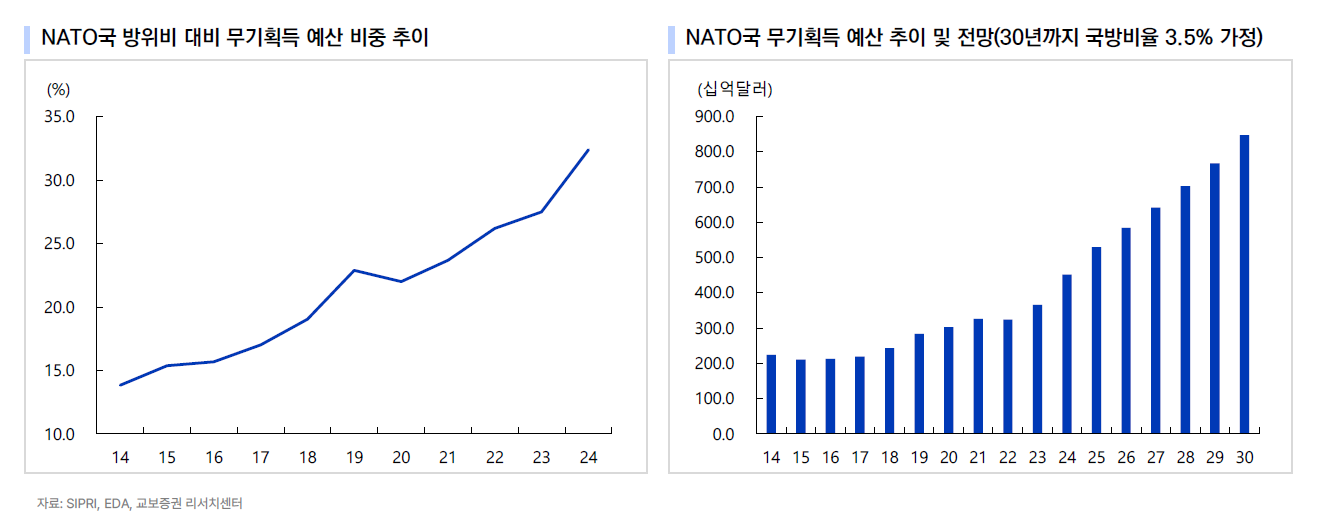 NATO 방위비 24~30년 CAGR 6.2%~9.4% 성장 기대(국방비율 3.5%~5.0%)